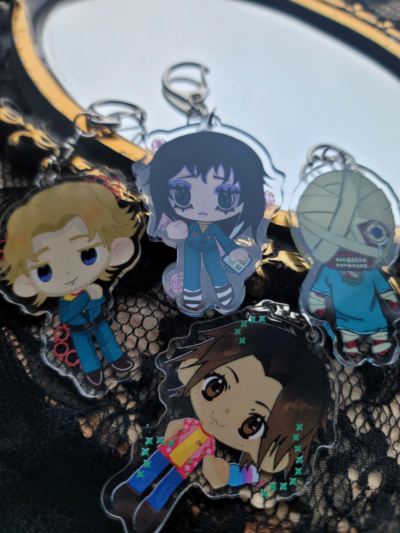 Made with Acrylic and 2.5 inches in size. Double sided and comes with clasp